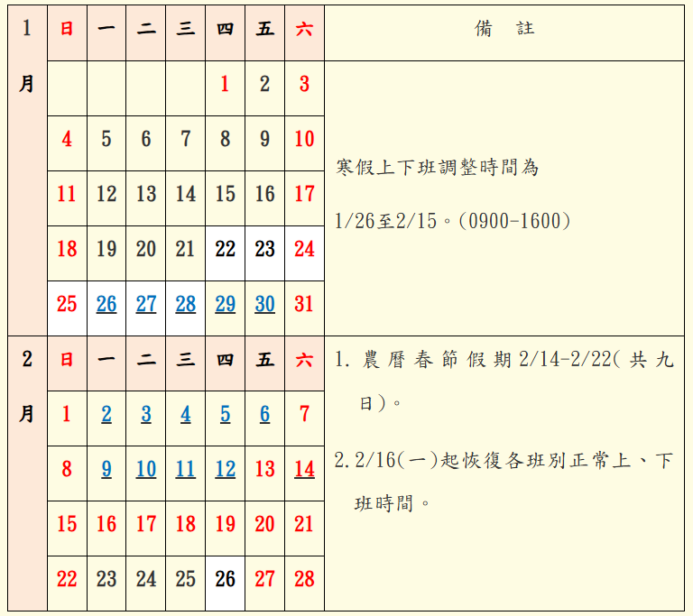 (二)115年2月16日(一)起恢復各班別正常上、下班時間。